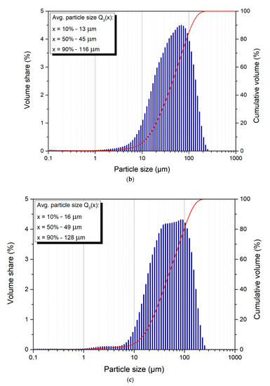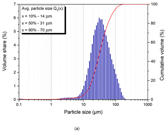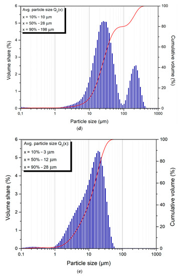 Figure 3 represents cumulative volume curve distributions (curve Figure 3a–e) and the general volume distribution (histograms Figure 3a–e) showing the particle size volume share for powder, milled for 13, 20, 30, 40, and 70 h, respectively. All samples maintain the range of particles from 10 to 100 μm with irregular, non-equiaxial shapes. The median value (Q3(x), where x = 50%) (Q3(x) 50%) of the particle sizes are 31 μm for 13 h, and 45, 49, 28, and 12 μm for 20, 30, 40, and 70 h, respectively. It can be clearly seen, that after 13 and 40 h of milling the particle size is similar, however, it sharply decreases after 70 h. For better visualization of the results Q3(x), where x = 10% and 90% are shown on their respective graphs.