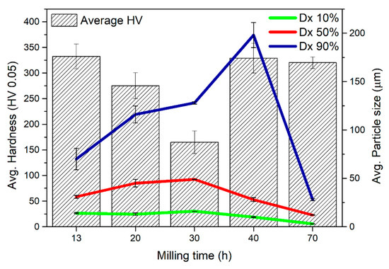 Average values of hardness measurements, as well as particle size, for Mg65Zn30Ca4Gd1 powder alloy milled for 13, 20, 30, 40, and 70 h are presented in Figure 4. The average values of hardness are 333 ± 24, 273 ± 25, 168 ± 22, 329 ± 29, and 320 ± 11 HV after 13, 20, 30, 40, and 70 h, respectively. The results are presented in Table 2. Correlating the values of the samples’ hardness with their average particle size, it can be said that after a certain amount of time the powders particles are fragmented more thoroughly, thus, decreasing in size. During this process, strong plastic deformation occurs due to constant friction welding and fragmentation which results in an increase in the hardness value [32,39,40,41,42,43]. Clearly, after 30 h of milling time, the hardness is lower that after 20 h, but it can be correlated to the particle size, as the size after 30 h is bigger as well [32,39,41].