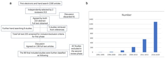 The review process was divided into two stages. In the first stage, the searched titles and abstracts were first screened for relevance, and then the full text of the relevant abstracts was evaluated. Any disagreements were resolved by combining the opinions of the final inter-reviewer. In addition, the selected journals were searched manually, and references of selected studies were searched. In the first step of the review process, the following exclusion and inclusion criteria were used to screen the obtained articles:
