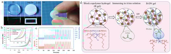 - Zhang, H.J.; Sun, T.L.; Zhang, A.K.; Ikura, Y.; Nakajima, T.; Nonoyama, T.; Kurokawa, T.; Ito, O.; Ishitobi, H.; Gong, J.P. Tough physical double-network hydrogels based on amphiphilic triblock copolymers. Adv. Mater. 2016, 28, 4884–4890. [Google Scholar] [CrossRef]