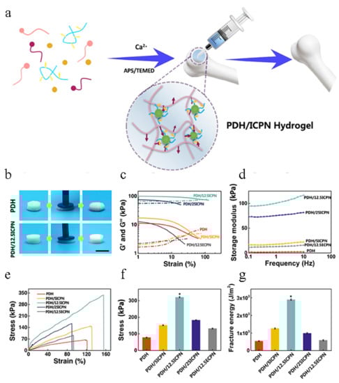 (a) Schematic illustration of the fabrication of the injectable PDH/ICPN hydrogel for bone regeneration. (b) Optical images of the PDH and PDH/12.5ICPN nanocomposite hydrogels under excessive compression (scar bar: 1 cm). (c) Strain-dependent (ω = 10 rad/s) (solid lines represent G′ and dashed line represent G″) and (d) frequency-dependent (at a strain of 1%) oscillatory rheological analysis results. (e) Stress-strain curves of the nanocomposite hydrogels with different calcium phosphate (CaP) contents. (f) Fracture stress and (g) fracture energy of PDH, PDH/mICPN, and PDH/12.5ECPN hydrogels (“*”: p < 0.05, indicating significant differences) [33].