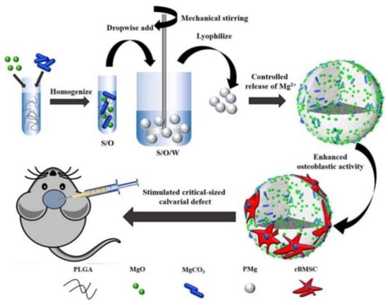Using poly (lactic acid-glycolic acid) (PLGA), magnesium oxide (MgO), and magnesium carbonate (MgCO3) as raw materials, a series of PLGA\MgO\MgCO3 (PMg) composite microspheres were prepared by the emulsion method. Controlled release of Mg2+ [39].