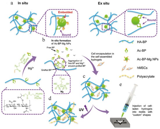 By immersing the prepared hydrogel in a CaCl2/NaH2PO4 solution, calcium phosphate (CaP) nanoparticles can be grown in situ in the gel network [47]. This solution not only improves the mechanical properties of the hydrogel, but also effectively enhances its osseointegration and osteoconductivity [48]. However, this process requires the hydrogel to be immersed in a salt solution with a higher pH and osmotic pressure, so it is not suitable for hydrogels encapsulated with cells [49]. Bisphosphonates (BP) have excellent binding power with multivalent cations, inorganic nanoparticles, and mineralized tissues such as bone [50]. As the second most common divalent cation in cells, magnesium ions have multiple functions such as regulating enzyme activity and promoting cell adhesion and differentiation [51]. Bian et al. [52] prepared an injectable nanocomposite hydrogel containing cells through the interaction of BP and Mg, and through the secondary crosslinking for a specific time, the crosslinking density was further regulated to achieve the purpose of regulating the differentiation of stem cells (Figure 5).