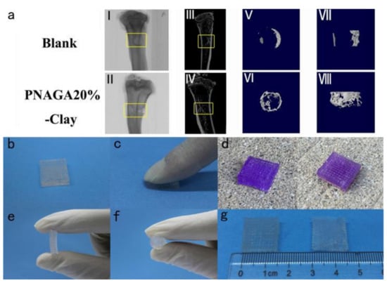 Characterization of implants and new bone formation by micro-CT (a(I,II)), micro-CT reconstruction images (a(III,IV)), and reconstructed 3D models (a(V–VIII)) of the new bones. Sequential fluorescent labeling blank photographs of PNAGA20%-Clay scaffolds showing their ability to resist finger compression (b,c), car wheel pressing (d), left and right denote before and after pressing), and hand folding (e,f). The scaffold is very stable even after immersing in water for a long time (g), left and right denote before and after water immersion for 3 months) [71].