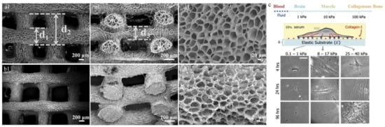 SEM images of the printed porous PNT-35%-6 hydrogel scaffolds (a1–a3) and the PNT-35%-6-β-TCP-22% hydrogel scaffolds (b1–b3). Top-down micrographs (a1,b1), cross-sectional view (a2,b2), and high magnification view of the surfaces (a3,b3), where d1 is the experimental printed filament diameter, d2 is the fiber spacing, and d3 is the layer thickness in the vertical dimension of each scaffold [77]. (c) The effect of material stiffness on cellular adhesion, differentiation behavior, and cell shape; the cells show branched and spindle shapes. The scale bar is 20 μm [76].