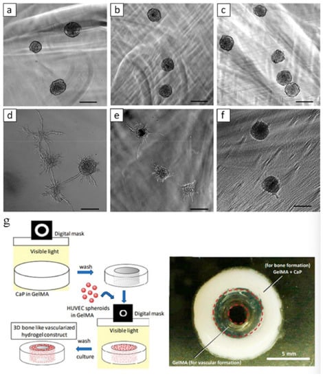 Three-dimensional in vitro angiogenesis of human umbilical vein epithelial cells (HUVEC) spheroids in the different concentrations of GelMA ((a,d) 5%, (b,e) 7.5%, and (c,f) 10%) just after polymerization of GelMA (a–c), and after 1 day of culture (d–f). Bars = 100 μm. (g) Schematic illustration of fabrication process for 3D hydrogel constructs. A photograph of 3D hydrogel constructs for vascular and bone formation. Bar = 5 mm [79].