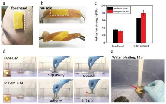 Wet tissue adhesiveness of Fe3+-polyacrylamide-hydrophobic stearyl methacrylate-N,N′-methylenebisacrylamide (Fe-PAM-C-M). (a) Photographs showing that the Fe-PAM-C-M hydrogel readily adhered to the forehead of one of the authors after perspiring. The humidity of the skin is higher than 120%. The size of the hydrogel applied on the skin is 10 mm in width, 20 mm in length, and 2 mm in thickness. (b) Photographs of a Fe-PAM-C-M hydrogel adhered to porcine muscle. No detachment or crack was observed between the hydrogel and tissue regardless of distortion. (c) The wet adhesion strength of Fe-PAM-C-M to porcine skin and bone tissues. The preload and contact time for tissue adhesion experiments are 5 kPa and 120 s. (d) Demonstration of underwater adhesion. The as-prepared hydrophilic PAM-C-M hydrogel was non-adhesive and slipped away from the metal block surface underwater, while the hydrophobic Fe-PAM-C-M hydrogel firmly adhered to the metal block surface and was able to lift the block (200 g) up underwater. (e) Photograph showing that the adhesion between the hydrogel and substrate is strong enough to resist water blasting for 10 s [95].