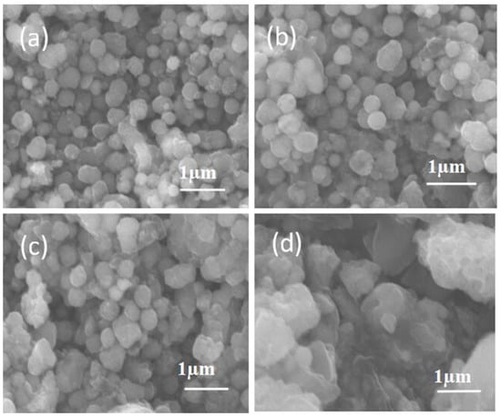 SEM images of Ni-Co-P samples with different ratio from (a) 1:1, (b) 1:3, (c) 1:5, and (d) 1:10.