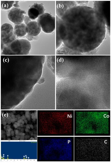 The inner architecture of P-1:3 sample (NiO/Ni2Co4P3) was further monitored by TEM. From Figure 3a–c, we can observe that the micrometer sphere is assembled by nano particles surrounded with visible pores, and its surface is relatively rough. There is an obvious gap between inner nanoparticles and pores, implying that it is not a unique solid sphere framework, as we previously reported []. This phenomenon can be ascribed to the influence of partly phosphorization. The expanded image in Figure 3d displays that there is significant separation between nanoparticles, and the particle boundary becomes rougher and vaguer, which further confirms the effect of partly phosphorization. Figure 3e further confirms the ratio of element, as well as the dispersion of nickel, cobalt, phosphorus and carbon. We can see that all elements are detected in the sample with the ratio of Ni, Co, and P reaching 2.12, 3.21, and 3.18. The good dispersion of carbon indicates the good electrical conductivity, which plays an important role in the stability of cycling performance.