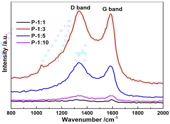 Raman spectra of the as-prepared samples are shown in Figure 4. There are two significant band peaks detected from the image, where the G band at 1334 cm−1 stands for the graphization of the carbon, and the D band at 1580 cm−1 represents the disorder structure or the structural defects. It is noted that the relative intensity ratio between D band and G band of P-1:1, P-1:3, P-1:5, and P-10 (ID/IG) varies from 1.01, 1.03, 1.08, to 1.00. With the increase of phosphatized reagent usage, the peak intensity becomes stronger and then turns to weak again, indicating that the electronic conductivity of the electrochemical reaction has been promoted, and possible existed oxygen-functional group can increase the structural stability. The weak broadening of the G and D bands without significant change of ID/IG ratio confirms the more disordered of surface phosphorized layer [].