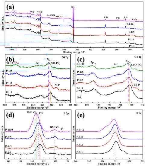 XPS spectra of Ni-Co-P samples with different ratio from (a) 1:1, (b) 1:3, (c) 1:5, and (d) 1:10, (e) O1s spectra.