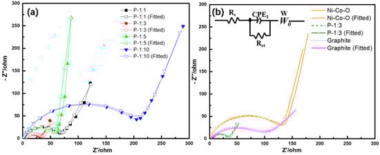 (a) Electrochemical impedance spectra (EIS) pattern of Ni-Co-P samples with different ratio from 1:1, 1:3, 1:5, to 1:10. (b) Comparison of EIS pattern between Ni-Co-O, P-1:3, and graphite.