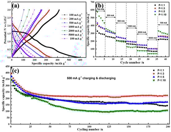 Galvanostatic charge/discharge and cycling stability tests of all samples were carried out to investigate the electrochemical performance of samples. When tested in 0.01–3.0 V as anode material in lithium ion batteries (Figure 7a), a specific capacity of 597 mAh g−1 is achieved at 100 mA g−1 specific current, while the value can be retained at 349, 281, 217, 120 mAh g−1 when the specific current increases to 200, 500, 1000, 2000, and 5000 mA g−1, respectively. After reset, the specific current to 100 mA g−1, the P-1:3 electrode still delivers 186 mAh g−1. Compared with other samples, as shown in Figure 7b, the P-1:1 sample exhibits a relatively much lower specific capacity at low specific current (100 mA g−1), and the P-10 sample demonstrates relatively lower specific capacity at high specific current (5000 mA g−1). The main reason for the poor rate capability of P-1:1 and P-1:10 can be attributed the lack of phosphorization and the destruction of sphere architecture, respectively. Among four samples, the P-1:3 and P-1:5 exhibit almost the same rate of capability and rate recovery ability. However, when both electrodes were cycled at 500 mA g−1 (Figure 7c), the reversible capacity of P-1:3 reaches 395.2 mAh g−1 and maintains at 224 mAh g−1 after 200 cycles, while the P-1:5 possesses 371 mAh g−1 for the 1st cycle but only delivers 172 mAh g−1 over 200 cycles. The better cycling stability of P-1:3, rather than that of P-1:5, may be due to the combination of hybrid structure of NiO/Ni2Co4P3, as well as perfect holding of microsphere structure.