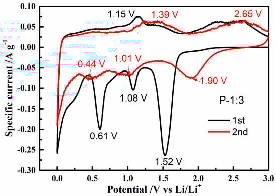 Cyclic voltammetry (CV) of P-1:3 sample was recorded at a scan rate of 0.1 mV s−1, and the result is shown in Figure 8. The initial cycle of the sample demonstrates an obviously charging/discharging plateau pair at around 1.15 V/0.61 V, which could be attributed to the decomposition of NiO/Ni2Co4P3 to metallic nickel and cobalt [,,]. The whole discharging reaction (1) and corresponding charging reaction (2) are summarized as follows: