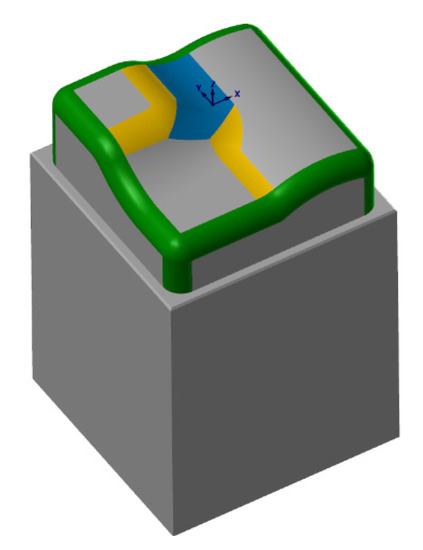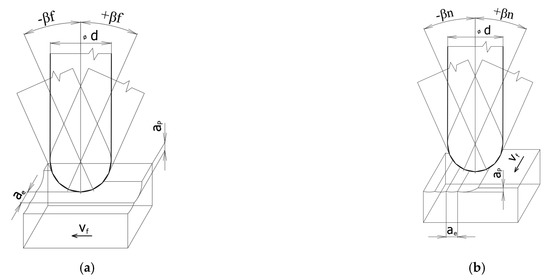 - 3-axis milling—the tool axis inclination angles are βf = 0°, βn = 0°, i.e., without changing the tool axis angle relative to the workpiece. It consists of one sample.