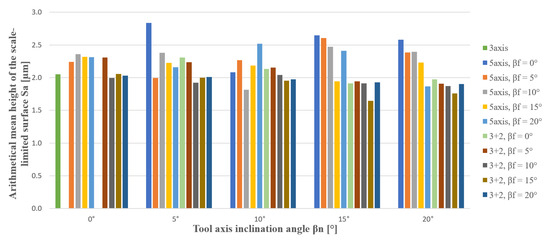 | Inclination Angle βf, βn | 3 + 2 -axis | 5-axis | 3 + 2 -axis Sa | 5-axis Sa | 3 + 2 -axis Sp | 5-axis Sp | 3 + 2 -axis Sz | 5-axis Sz | 3 + 2 -axis Vmp | 5-axis Vmp |