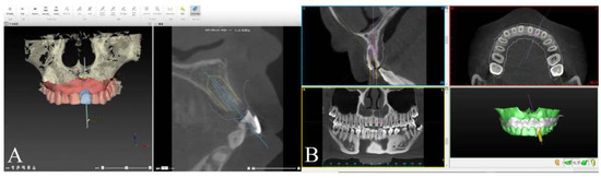 Over the last decades, the computer-aided implantology (CAI) has drawn more and more attention with the potential for a more accurate, predictable and less invasive surgery [1,2,3]. Furthermore, unlike traditional free hand surgeries based on the operators’ experience and imagination, CAI followed the principle of “prosthesis-driven” implant placement, creating an ideal situation for anterior aesthetic restorations [4,5]. Commercially planning software such as SimPlant® and Nobel Clinician®, in combination with three-dimensional (3D) tissue information obtained from cone beam computed tomography (CBCT) and optical scan, opened the possibility for adequate preoperative design [6,7,8,9,10]. However, the data acquisition and virtual planning were only the preoperative stages of CAI, and it was the essence to find a reliable transfer approach to guide the surgical procedure [11]. Recently, due to the rapid development of computer-aided design/manufacturing (CAD/CAM) and 3D printing techniques, the presurgical planning could be transferred to the clinical situation by static surgical templates, allowing the clinicians to reproduce the virtual treatments intraoperatively [12,13].