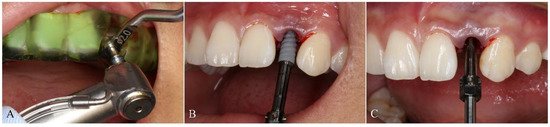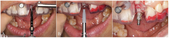 Surgical procedure with half-guided surgical template. (A) The implant preparation with the drill under the guide of template; (B) implant was inserted with free hand and (C) depth was controlled by visual estimation.