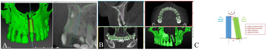 Postoperative CBCT was taken immediately after the surgery using the same parameters as preoperative scans and imported in the digital software (Mimics®, Materialise, Leuven, Belgium) for 3D reconstruction. Subsequently, the postoperative model was superimposed on the preoperative CBCT image in the corresponding design software (SimPlant® or Nobel Clinician®), which contained the information of planned implant (Figure 5A,B). The pre- and postoperative data were matched using automated tools at first, and then they were aligned by superposing some anatomic landmarks (range 5–8) manually. The plane with the largest overlap area between planned and actual implant was selected as the measurement plane, and the following parameters were evaluated: global coronal/apical deviation determined as the liner distance between the coronal/apical center of the planned and actual implant positions, depth deviation measuring the vertical distance between the apical centers of the planned and actual implants, and angular deviation, which was calculated as the angle between the two respective long axis (Figure 5C). A positive-valued deviation in depth meant the actual implant position was higher than the planned sites, while a negative value indicated the implant was inserted too deep. Actually, the global coronal and apical deviation could be decomposed into the deviations parallel to the long axis of the implant and the deviations in the horizontal plane. In order to further analyze the horizontal coronal and apical deviation, we introduced a statistic method to exclude the influence of implant depth on the final results of the liner coronal and apical deviations.