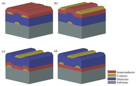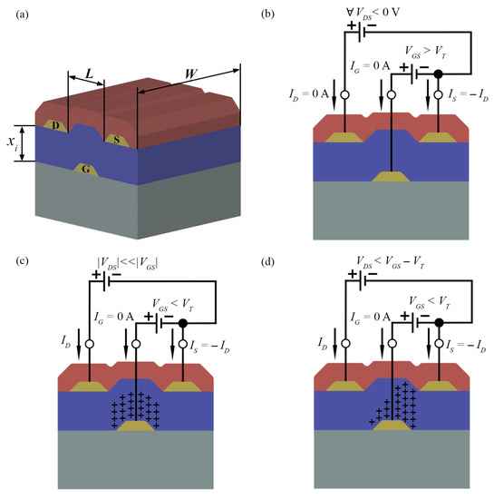 The first operating mode, i.e., the cut-off, as shown in Figure 3b, is defined for (i.e., V), in which the applied is not able to form a conducting path between source and drain, the channel is depleted of holes and the drain-to-source current () is zero. Ideally, the leakage current through the gate dielectric is also considered to be zero.