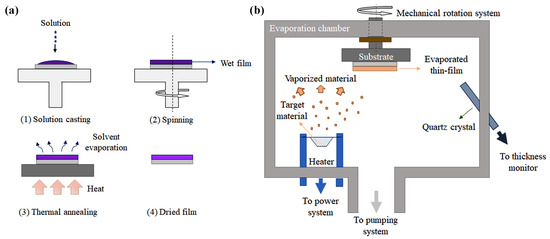 Illustration of well-established and pioneering techniques for thin-film deposition of organic electronic devices: (a) spin coating and (b) thermal evaporation.