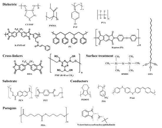 The migration to alternative platforms for device processing, however, makes it necessary to find a replacement also for SiO. This high-quality dielectric oxide is rather inconvenient for fabrication of low-cost flexible sensors, since it is grown by thermal oxidation of Si at a temperature (>) well-beyond melting of flexible substrates (200–). Inspiration came from wet-processed polymer dielectrics already used in clean room facilities for the fabrication of integrated circuits (IC) and microelectromechanical systems (MEMS) on Si wafers. Among the most-used insulating polymers one can cite the fluoropolymer Cytop [82,84,89,89], as well PMMA [96,98,99,101,102,104,105,106], poly(imide) (PI) [100], poly(4-vinylphenol) (PVP) [85], poly(styrene) (PS) [103,107] and poly(vinyl alcohol) (PVA) [107]. Kapton, a PI-based dielectric, withstands both high temperatures (<) and organic solvents, and for that reason, it is often used as a substrate. Since most dielectric polymers are not chemically-resistant, cross-linkers (e.g., 4,4-(hexafluoroisopropylidene)- diphthalic anhydride (HDA) [85] and poly(melamine-co- formaldehyde) methylated (PMF) [39]) are blended to the dielectric solution before deposition. Even though most electrodes are based on noble metals, it is worth mentioning that compounds based on poly(aniline) (PAni), poly(3,4-ethylenedioxythiophene):poly(styrene sulfonate) (PEDOT:PSS) and graphene are alternatives to achieve all-organic sensors. They are not only characterized by a reasonable optical transparency, similarly to organic dielectrics and substrate, but also for lower contact barriers with organic semiconductors for charge transport. It is not a surprise that these polymeric conductors are often used as thin (25–100 nm) hole injection layers (HILs) in OLEDs and hole transport layers (HTLs) in OPVs [130,131,132,133]. The chemical structures of the recently most-used organic dielectrics, cross-linkers, SAM, substrates and conducting molecules for gas sensing applications with OTFTs since 2015 are shown in Figure 8.