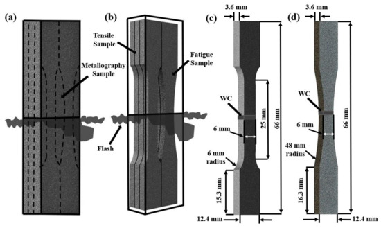 Schematics showing the (a,b) EDM plan for extracting the tensile, metallography, and fatigue samples from the welded coupons; (c) geometry of the tensile samples; and (d) geometry of the fatigue samples.