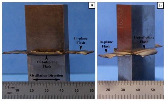 The LFW process consists of oscillating one part under an applied pressure against another stationary part, as illustrated in Figure 1. After LFW, the visual examination of the AWed coupons indicated a considerable amount of flash extruded along all the four edges, and the single flash layers generated along the oscillation direction (in-plane) were longer than along the specimen width (out-of-plane), as seen in Figure 3a,b. Both the in-plane and out-of-plane flash layers comprised of highly deformed material generated as a combined result of frictional force/heat and the oscillatory motion. A close examination of these flash layers revealed the presence of ripples or ridges, which may be attributed to the reciprocating motion that extrudes the plasticized material in a stepwise fashion. Additionally, the number of ripples on the in-plane flash (i.e., along the oscillatory direction) layers was found to be higher than that along the out-of-plane flash layers (i.e., perpendicular to the oscillation direction). These findings are consistent with the flash layer morphologies observed previously for near-α [32,33] and α-β titanium [6] alloys. Studies to understand the mechanisms of ripple formation have indicated that the flash layer morphology is sensitive to the process parameters [47]. A rippled morphology results from process conditions (e.g., large oscillation amplitudes) that lead to a predominating shearing mechanism and the partial separation of the flash from the workpieces [48,49]. By contrast, a smooth (rippleless) morphology is possible when the process conditions (e.g., low oscillation amplitude) cause a predominant forging mechanism by which the flash remains fully connected to the workpiece [49,50]. Interestingly, for a metastable or near-β titanium alloy (Ti-5Al-5V-5Mo-3Cr), Dalgaard et al. [18,19] reported a smooth morphology using process conditions comparable to Ti-64, which suggests that, apart from the role of the process conditions/parameters, there may be an additional effect of crystallographic slip on the flash formation mechanism.