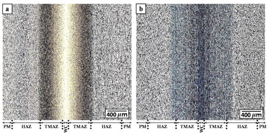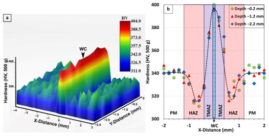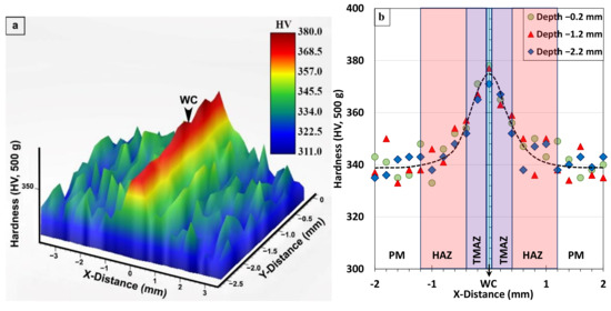 For a clear understanding of the hardness distributions across the PM, HAZ, TMAZ, and WC regions, a 3-dimensional (3D) microhardness map covering all these regions was generated within an area of 7.5 mm × 2.5 mm (L × D) on the polished (mirror finished) surfaces of the AWed and SRAed transverse weld sections (i.e., perpendicular to the oscillation direction). Microhardness measurements, in accordance with the guidelines in ASTM E92-17 [44], were carried out using a load of 500 g with a dwell period of 15 s and at an indent spacing of 0.2 mm on a fully automated Struers DuraScan 80 hardness tester (Ballerup, Denmark) equipped with a motorized x-y stage and an in-built microprocessor.