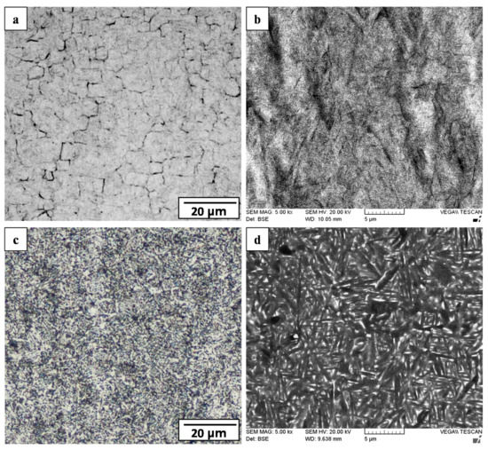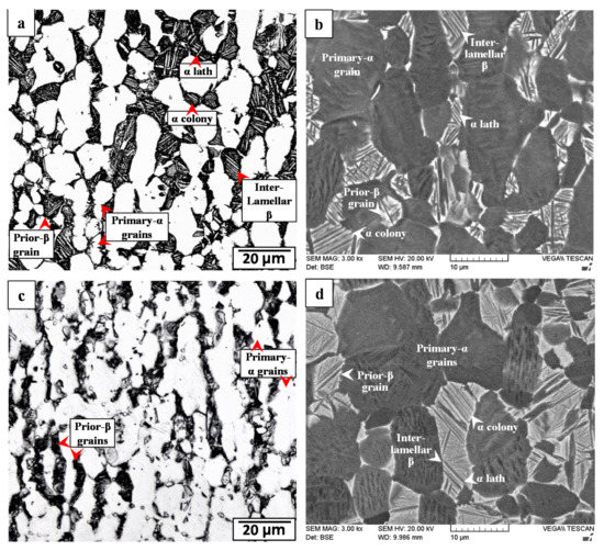 Ti-6242 PM microstructure: (a,b) as-received (OM and SEM) and (c,d) SRAed (OM and SEM).