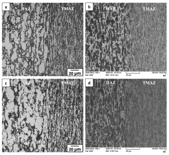 HAZ and TMAZ in Ti-6242 welds: (a,b) AWed (OM and SEM) and (c,d) SRAed (OM and SEM).