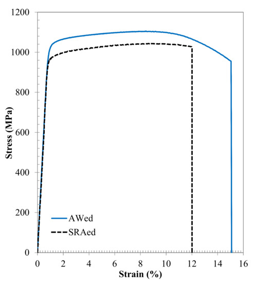 Guided by the principles given in ASTM E8M-16a [45] for tensile testing and ASTM E466-15 [46] for fatigue testing, standard sub-size samples were machined (to a finish of 1 µm) from the AWed and SRAed coupons to the geometries shown in Figure 2c,d, respectively. To evaluate the room temperature properties, a 250 kN MTS testing frame was used for the uniaxial tensile and fatigue tests. The tensile tests were conducted until rupture with a displacement control rate of 0.125 mm/min, which corresponds to an average strain rate of 0.005 min−1. A calibrated laser extensometer was used to measure the changes in the gauge length during the tensile test. A minimum of three sets of AWed and SRAed tensile samples were tested to calculate the average tensile properties, which included the yield strength (YS), ultimate tensile strength (UTS), and percent elongation (El).