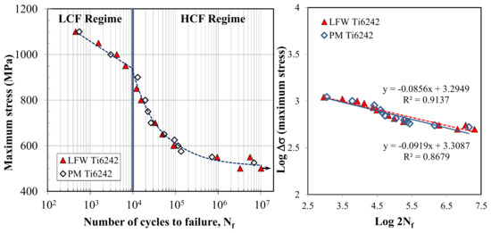 Fatigue life curve for Ti-6242 PM and SRAed linear friction welds tested at room temperature, R = 0.1: (a) semi-log scale plot of the maximum stress versus the number of cycles to failure (Nf) with the LCF and HCF regimes and (b) double log scale plot of the maximum stress versus the number of reversals to failure (2Nf).