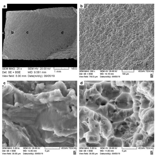 As mentioned, for all the samples tested under LCF and HCF conditions, the joints failed in the PM region approximately 3 ± 1 mm away from the WC, and thus the fatigue fracture features of the linear friction welds resembled the characteristics of Ti-6242 alloy. The findings from fractographic analysis of the LCF and HCF fracture surfaces are shown in the representative SEM images in Figure 13 and Figure 14 as low- and high-magnification sequences. The examination of the LCF and HCF fracture surfaces did not show any visible defects, such as macro porosities, inclusions, etc., and failure was seen to initiate from an asperity on the surface, as indicated by the arrows in Figure 13a and Figure 14a.