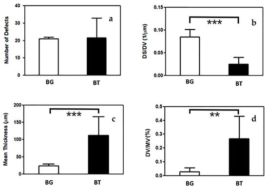 Results obtained by the Defect Analysis Tool, which compared BG and BT groups. As resulting from Table 2, (a–d) show the number of defects (a), DS/DV (b), mean thickness (c) and DV/MV (d). Three levels of statistical significance were considered: p < 0.01 **, p < 0.001 ***.