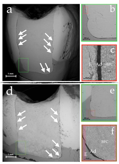 This scanning electron micrographs display a representative mesial view of class II restoration of BG (Bulk&Go group) and BT (Bulk Traditional) sample ((a,d), respectively). The green inset (b,e) shows the tooth–restoration interface, which at higher magnification (red inset, (c,f)) highlights the presence of three different structures: Enamel (E), adhesive layer (Ad) and bulk-fill composite (BFC), without any gap formation on the external margin.