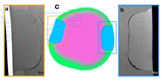 The measurement of the shrinkage in a cavity is technically challenging; thus, several in vitro methods have been described in the scientific literature to analyse the PSS effect []. The evaluation of leakage in class II restorations is a common procedure of analysing the long-term stability of adhesive and composite resin systems []. The most frequently used method to examine the internal adaptation is the dye penetration, which evaluates the interface between the resin composite and the dental substrate, using basic fuchsin, methylene blue, erythrosine, silver nitrate, or radioactive markers []. However, in performing this technique, the samples need to be sectioned, which obviously limits further material characterization and may lead to false interfacial leakage. The internal adaptation can be also evaluated by scanning electron microscope (SEM) after sectioning, obtaining a qualitative evaluation of the surface morphology. Moreover, the energy dispersive X-ray spectroscopy (EDS) is used to investigate the chemical composition of the tooth–restoration interface. Therefore, the effort of coupling these analytical techniques represents a valuable tool to obtain a comprehensive overview of the morphological different structure of tooth/material interface. However, this method is very sensitive, and has several limitations concerning the quantitative assessment, which is based on the operator’s visual evaluation and does not represent, being two-dimensional (2D), the entire gap volumes.