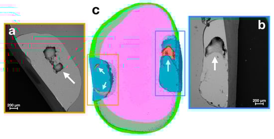 SEM observations of restorations gaps (a,b) and µ-CT coloured 3D reconstruction of a BT representative sample (c). SEM observations of the restorations presenting several defects (arrows in (a,b)) and µ-CT coloured 3D reconstruction of a BT representative sample with defects (arrows in (c)). The void formation in micrograph (a) is split in two different defects in the 3D model (orange inset of (c)). The void formation in micrograph (b) represents the defect inside the restoration (blue inset of (c)). Green—enamel; pink—dentin (in transparency the superposition of the dentin with the enamel); blue—restorations (in transparency superposition of the dentin with the restoration); red—defects.