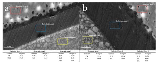 The scanning electron micrographs displayed the three different structure of tooth–interface surface of BG and BT groups ((a,b) respectively). Selected Area 1: Enamel surface (E); selected Area 2: Adhesive layer (Ad); Selected Area 3: BFC surface (BFC). EDS results of BG and BT groups are reported in the table analysing the different elements as follow: Phosphorous (P), calcium (Ca), carbonium (C), silicon (Si), zirconium (Zr), and ytterbium (Yb).