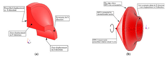 For the simulation of the torsion test of the specimen A, structural multipoint constraints (MPC184) were utilized to load the specimen in torsion. The nodal displacement in “x” direction and antisymmetry plane in “x” direction were used (see Figure 4b). Fix of displacement of nodes in “x” direction was sufficient since Ansys’s antisymmetry plane formulation treats, in this case, all other degrees of freedom. Observing the boundary conditions, one can see that all simulations were displacement-controlled.