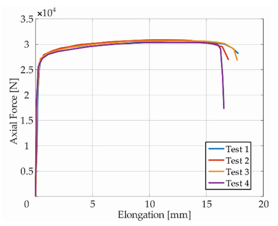 All specimens were subjected to loading, as described above. Each test was deformation-controlled. Values of applied force or torque were recorded by the testing machine, and the values of deformation were recorded by the DIC system. Because the experimentally measured data embodies natural oscillations, the presented force vs. elongation diagrams were smoothed using functions of the Curve Fitting Toolbox in Matlab; see Figure 5 showing an example from monotonic tensile tests. The combination of moving average and smoothing splines led to sufficient results. Optimal smoothing parameters were chosen with respect to the size and character of the data sets.
