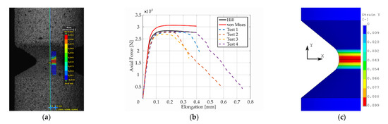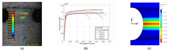 Maximal principal strain distribution (a), dependency of force on elongation compared to experimental and simulation results (b), and FEM result with Hill’s criterion material model (c) for specimen C.
