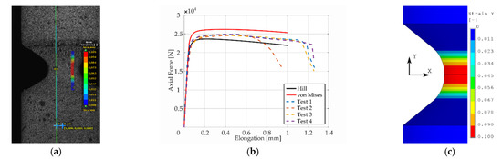 Longitudinal strain distribution (a), dependency of force on elongation compared to experimental and simulation results (b), and FEM result with Hill’s criterion material model (c) for specimen D.