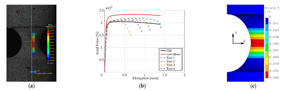 Maximal principal strain distribution (a), dependency of force on elongation compared to experimental and simulation results (b), and FEM result with Hill’s criterion material model (c) for specimen B.
