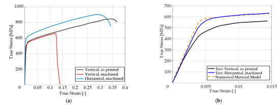 Three characteristic true stress–true strain curves for stainless steel 316L specimens produced by selective laser melting technology (a), and a detail of the material model response and experiment for the specimen “as printed” in the vertical direction and machined in the horizontal direction (b).