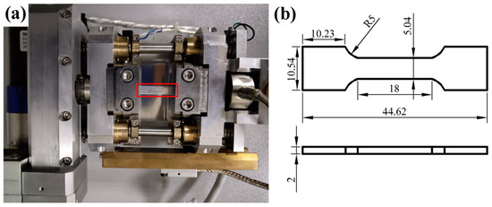 (a) In situ tensile testing system. (b) The machined size of the in situ tensile specimen (unit: mm).