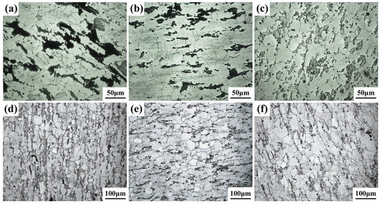 Optical microscopy OM photos of the alloy after different solid solution treatments. (a) 480 °C × 10 h. (b) 510 °C × 10 h. (c) 510 °C × 13 h. (d) 510 °C × 16 h. (e) 510 °C × 19 h. (f) 510 °C × 22 h.