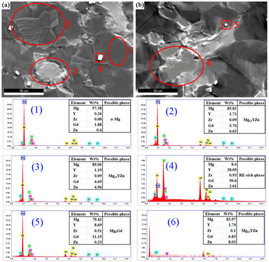 Take the sample of 510 °C × 13 h as an example. Figure 4 shows the results of EDS analysis. Figure 4a,b comes from the same sample. The atomic ratio of the Mg element at spot (1) in Figure 4 is close to 100%, indicating that it is the α-Mg matrix phase. The chemical composition of the block-shaped phase (Figure 4, spot (2)) was Mg-5.76Gd-1.71Y-6.63Zn-0.09Zr (at.%), which indicates that the stoichiometry of this phase was near Mg12YZn (LPSO phase). The chemical composition of the lamellar phase (Figure 4, spot (3)) was Mg-4.69Gd-1.19Y-4.96Zn-0.09Zr (at.%). Furthermore, the lamellar phase emerged inside α-Mg grains and the content of Mg was high due to the selected part of the matrix phase. Though the morphologies of the phases were different, spot (2) and spot (3) were considered to be the same phase due to their similar element content. This may be the LPSO phase. The LPSO phase is an ordered structure in which the main components are RE and Zn atoms placed periodically in the Mg basal planes [16,17]. As an important type of Mg alloy, Mg-RE-Zn alloys have attracted attention recently due to their enhanced properties caused by their LPSO structure. The cubic-shaped phase (Figure 4, spot (4)) could be considered to be an RE-rich compound due to the EDS results. The chemical composition of the phase (Figure 4, spot (5)) was Mg-11.15Gd-8.69Y-0.23Zn-0.51Zr (at.%), which indicates that the stoichiometry of this phase is near Mg5Gd. However, the Mg content was high due to the selected part of the matrix phase. The chemical composition of the phase (Figure 4, spot (6)) was Mg-6.83Gd-1.74Y-8.03Zn-0.1Zr (at.%), which indicates that the stoichiometry of this phase was near Mg12YZn. Basically, according to the XRD and EDS results, the black phase was the α-Mg matrix phase. The granular phase was mainly Mg5Gd. The main component of the grey layer LPSO phase and the bulk LPSO phase was Mg12YZn. The white square phase was the RE-rich phase.