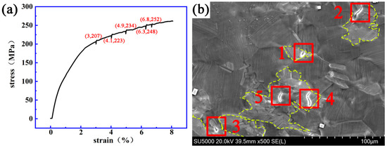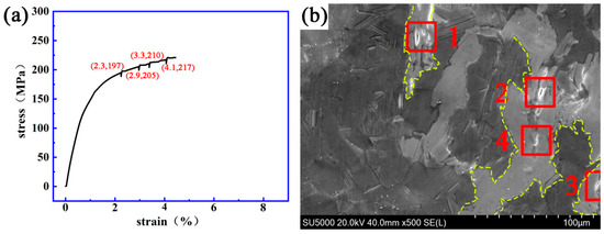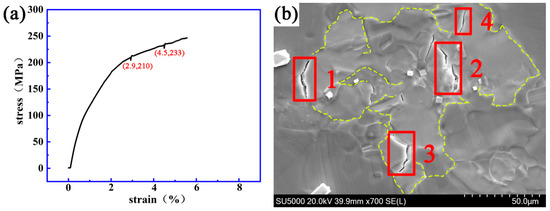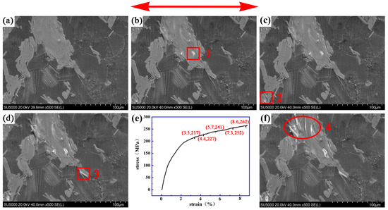 Figure 10 shows that when the strain and stress are 2.9% and 210 MPa, respectively, crack “1” will appear on the grain boundary. When the strain and stress are 4.5% and 233 MPa, respectively, crack “2” will appear on the grain boundary; then cracks “3” and “4” will also appear, and the white second phase can be seen near the crack. The initial length of crack “1” was 1.3 μm and the final length was 12.1 μm. The fracture strain and stress of the specimen were 5.6% and 251 MPa.