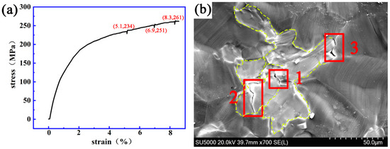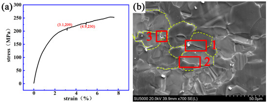 Figure 9 shows that when the strain and stress are 3.1% and 209 MPa, respectively, crack “1” will appear on the grain boundary. When the strain and stress are 4.9% and 230 MPa, respectively, crack “2” will appear at the grain boundary; then crack “3” will also appear. The initial length of crack “1” was 3.8 μm and the final length was 3.9 μm. The fracture strain and stress of the specimen were 7.7% and 253 MPa.